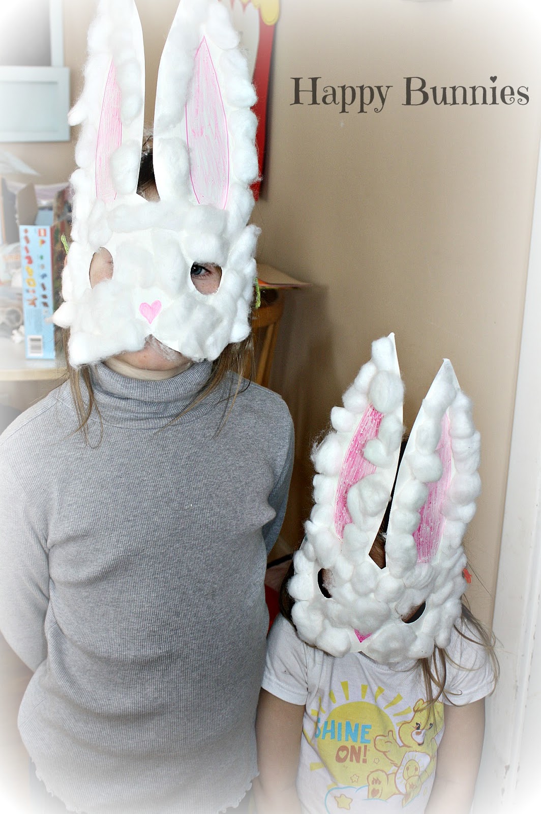 We also made masks. I didn't use a pattern for this one. I simply used white bristol and my own hand drawing of rabbit face with ears. My inspiration came from here. Of course you can google rabbit masks for templates and there are several excellent resources for patterns. I wish I remembered to add our whiskers.